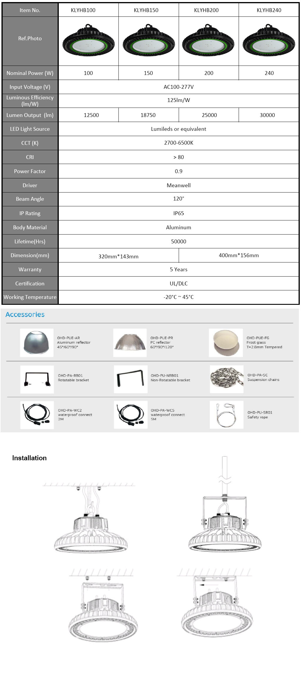 · Fully equipped accessories, includes PC reflector, Frost glass, brackets, Suspension chains, safety rope.